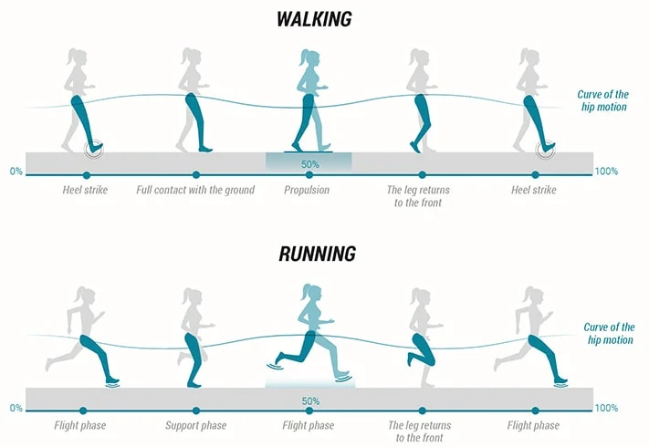 Walking is fundamentally different from jogging, running, and sprinting in that when a person is walking, they always have at least one foot touching the ground. On the other hand, when a person is jogging, running, or sprinting, there are moments between steps where both feet are off the ground, known as flight time. Although jogging may seem slower than walking for some individuals, it still includes flight time.